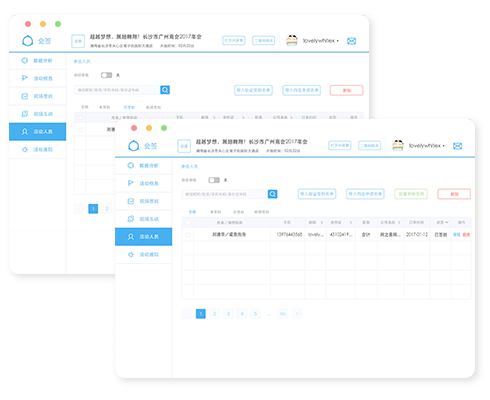 ?人員信息導(dǎo)出 ?智能嘉賓分房號 ?簽到數(shù)據(jù)導(dǎo)出 ?人員列表展示